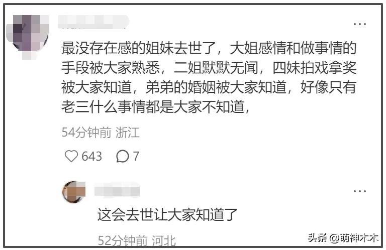 網友對於何超蕸的離世也很唏噓,感覺她還很年輕,畢竟長姐何超瓊還精神百倍的開疆拓土,她卻早早離開人世。