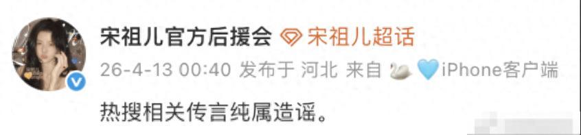 搜狐娛樂訊 4月13日凌晨,宋祖兒官方後援會闢謠疑似宋祖兒小號曝光一事,表示“熱搜相關傳言純屬造謠”。此前,宋祖兒粉絲也已針對網傳賬號中的內容進行闢謠,賬號主人“2016上大學”和“愛喫榴蓮”的特徵與宋祖兒個人情況並不相符。