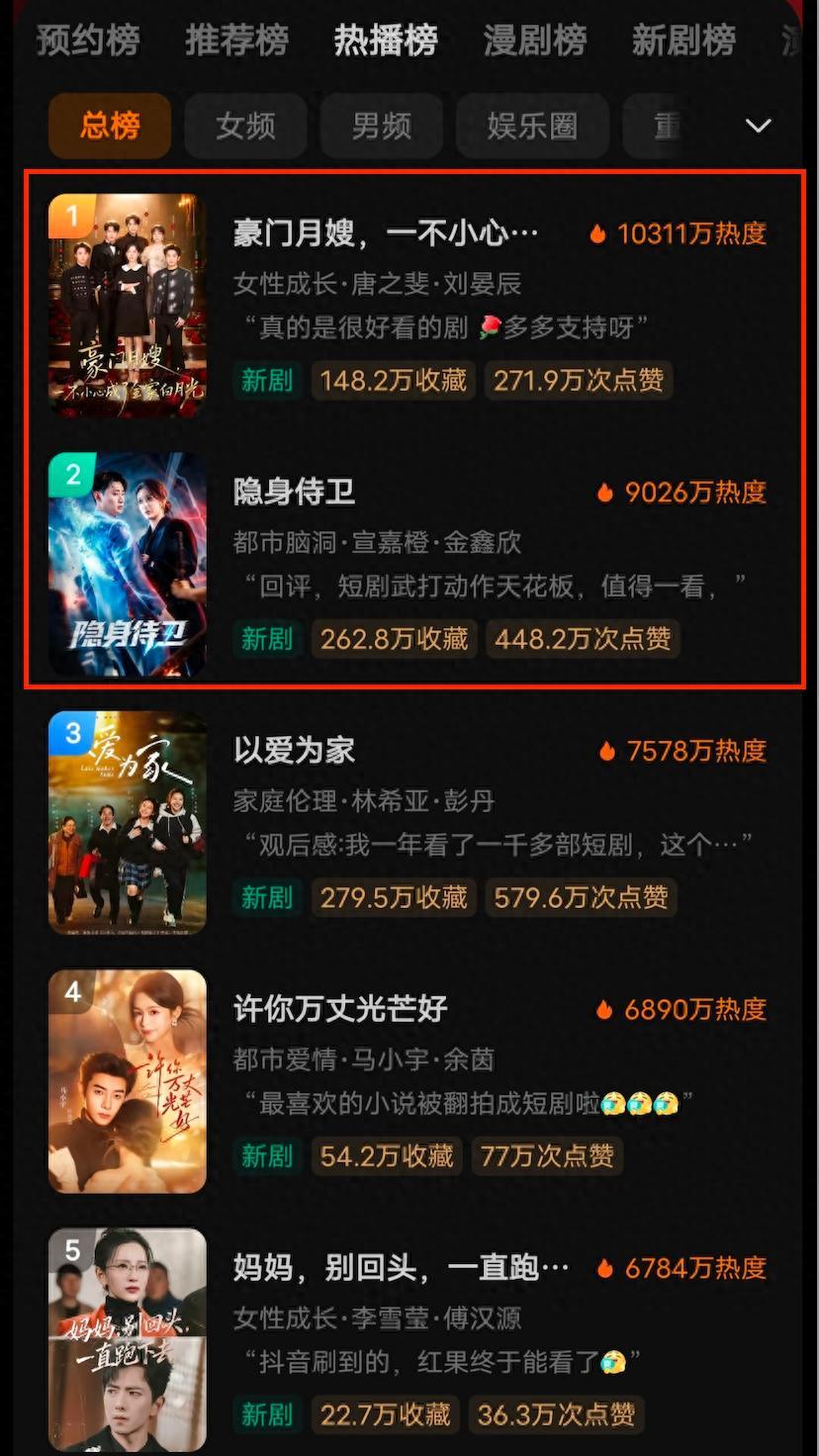 最近,接連有多部以三保(保姆、保潔、保安)爲主角的短劇登上熱榜前列:《豪門月嫂一不小心成了全家白月光》熱度峯值突破1億,收穫超380萬收藏,播放量破5億;《我在姜府當奶孃的日子》熱度破7590萬,收藏量超190萬,男頻短劇《隱身侍衛》也達到了1億以上的熱度,超320萬收藏。