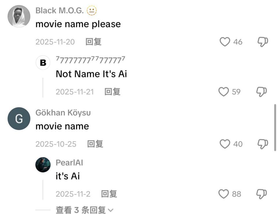 整部劇鏡頭跳轉極快,劇情推進也快,還常常會在結尾留下鉤子。評論裏,很多人都以爲這些視頻是某部作品的切片想找完整版,出現最多的評論就是“Movie name,please”,很快就會有人回覆他這是AI短片。
