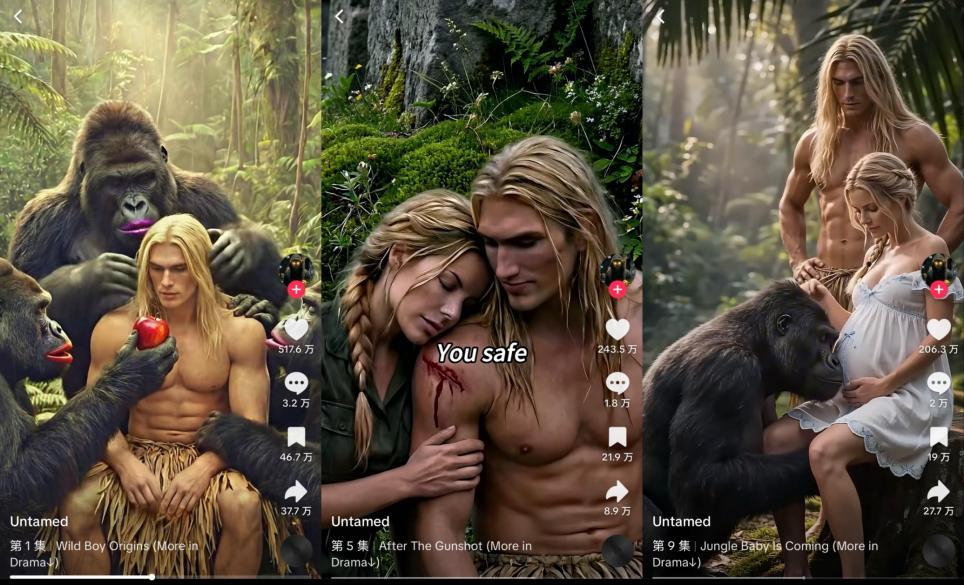 該劇改編自大衆熟知的人猿泰山故事。自幼被猩猩撫養長大的男主遇到了前來森林科考的女主,兩人相愛並結婚生子,還一起保衛森林抵禦外來入侵者。該劇比起早期的5集小故事,已經有了更長、更完整的敘事,集均百萬點贊,評論中不少用戶表示能看出來是AI製作,但還是看完全集並持續追更。