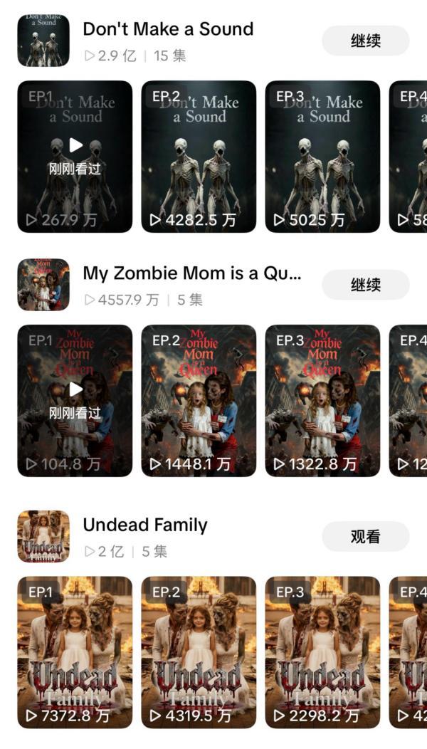 AIGC導演思今的團隊就製作過多部播放量過千萬次的喪屍題材海外AI短劇,在他看來,喪屍世界中人類生存壓力大,看人類在極致環境中逃生對於受衆來說有一種解壓爽感。“國外觀衆很喜歡看真善美的情節,特別是與愛、家庭相關的東西,因此所以很多喪屍題材都是父母救孩子、孩子救父母的劇情,甚至情侶互救不如親子互救的播放量高”。