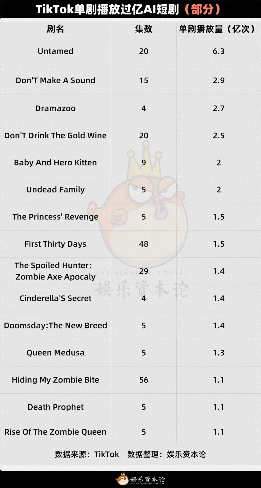 最近的爆款AI短劇《Untamend》就是先上線10集,播放量7天超過3億次,一個月後又上了10集,現在累計播放量超過6.3億次。娛樂資本論注意到,在這個賬號上,大部分短劇仍然是5-10集的體量,30集以上的短劇寥寥無幾。