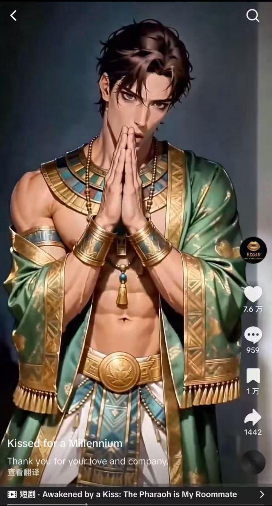 上週TikTok公佈的Q1分賬戰報中,盛影文化製作的女頻AI漫劇《Awakened by Kiss:The Pharaoh is My Roommate》(我的室友是法老)位列其中。故事講述在古董倉庫工作的Ella被男友Jason的前任當衆羞辱。爲了取樂,對方逼她去親吻一尊古老的法老鵰像,卻沒想到這一吻竟意外喚醒了沉睡千年的神祕詛咒。