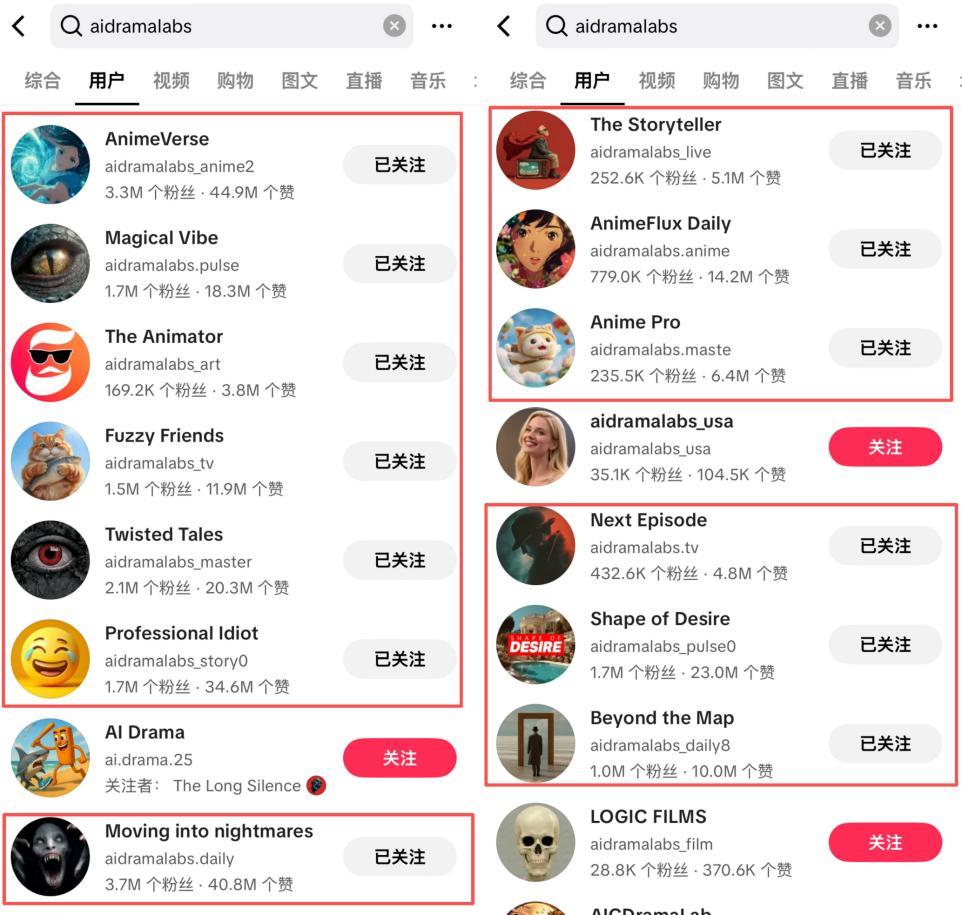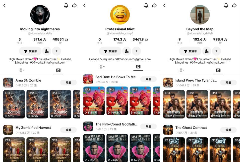從簡介來看,這些用戶名中出現“aidramalabs”的十幾個賬號均來自於同一團隊。娛樂資本論瞭解到,這些賬號其實是TikTok內部孵化的官方賬號,去年年中就開始向外尋找優質團隊進行AI短劇承製。