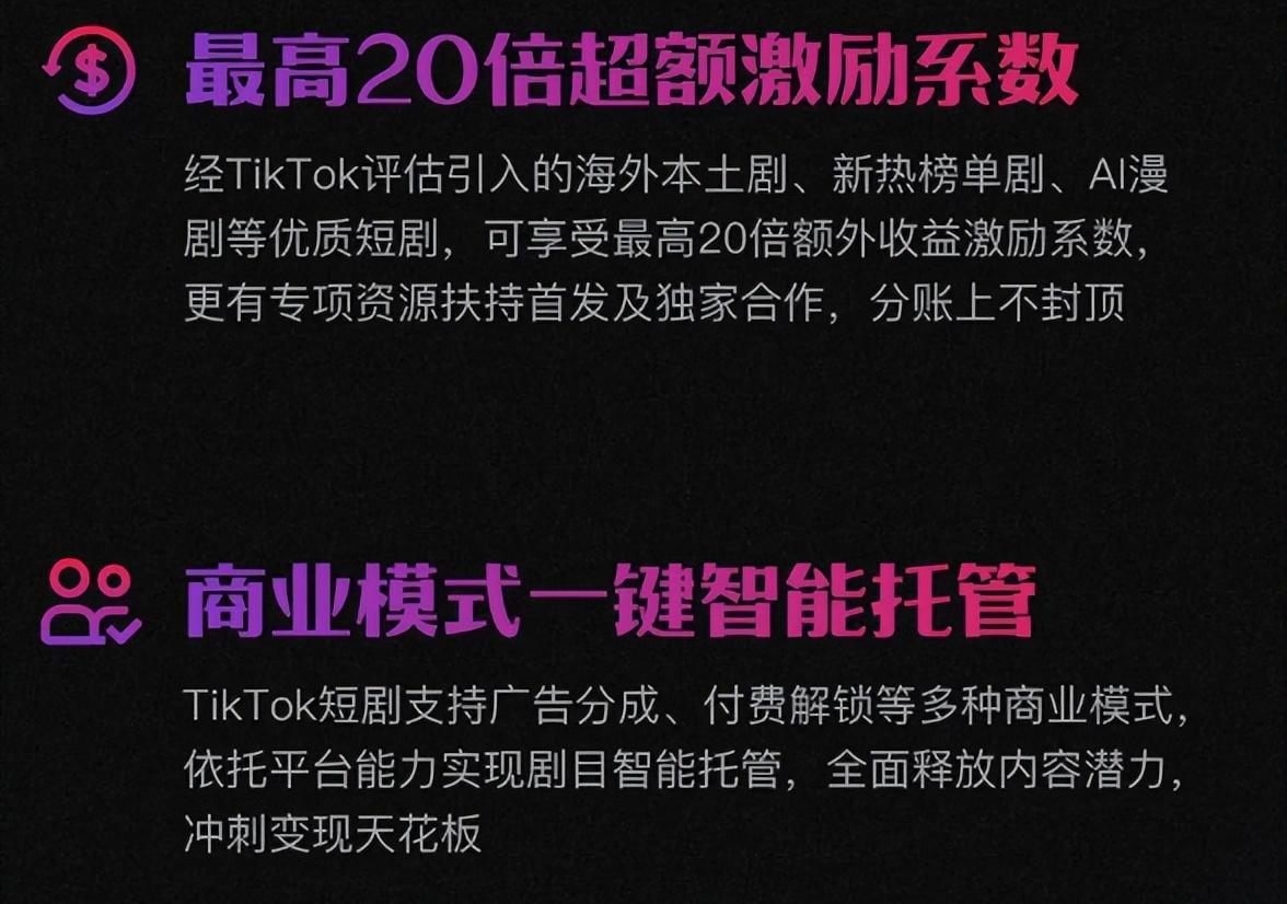 除了承製模式,TikTok還在今年1月推出了廣告分成與付費解鎖的合作模式,合作方最高可享20倍額外收益激勵,上週Q1分賬戰報出來後,“價值稀缺”的AI仿真人劇激勵係數提升至100倍。
