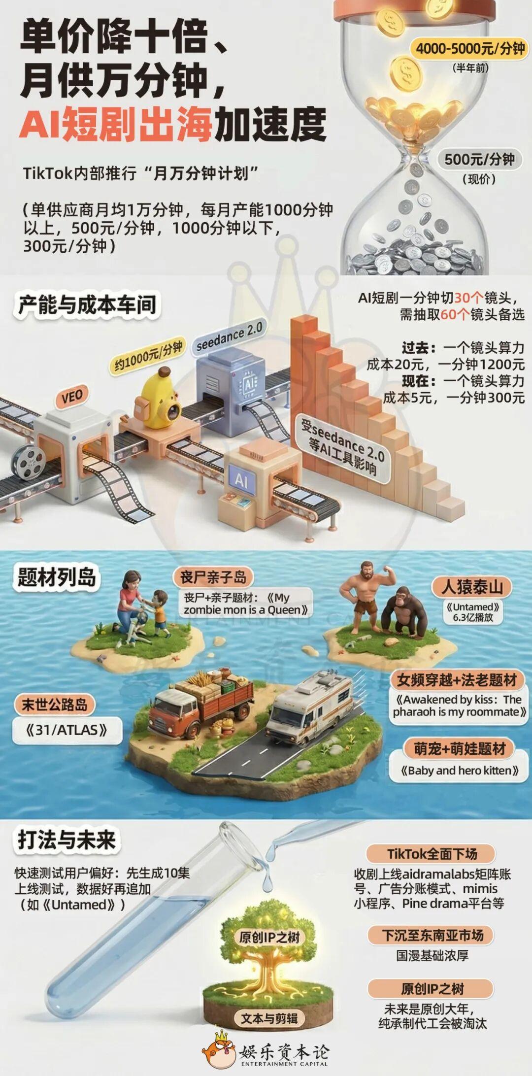 有從業者告訴小娛,Seedance2.0上線後,TikTok內部還提出過“月萬分鍾計劃”,希望每個供應商每個月提供1萬分鐘的AI短劇內容,承製費每分鐘單價也下降至300-500元。