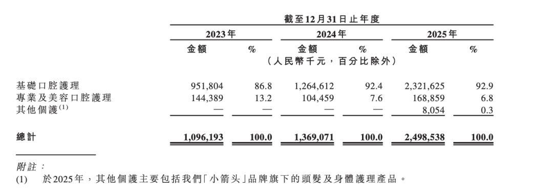華晨宇的到來,成爲關鍵的業績變量。招股書顯示,2025年,小闊科技營收同比激增82.5%,新增的11.3億元營收中,基礎口腔護理(牙膏、牙刷)貢獻了10.57億元,成爲業績核心增長支柱,這一爆發節點與官宣華晨宇代言高度重合。