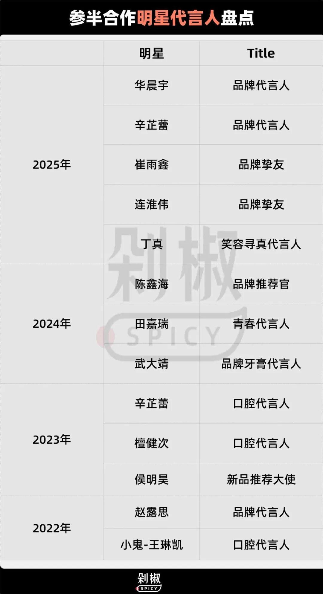 據剁椒Spicy盤點,自2022年起至今,與參半達成代言合作的明星多達12個,其中絕大多數爲品牌推薦官,真正的代言人僅有趙露思、辛芷蕾和華晨宇三人。