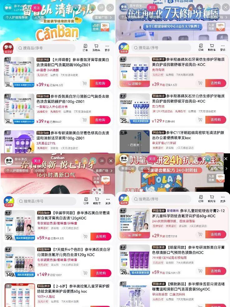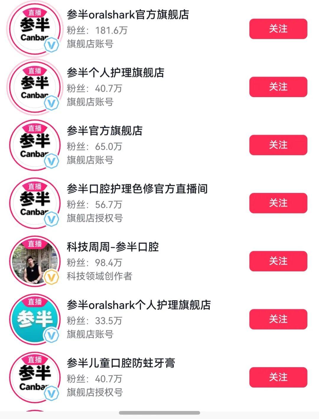 另外幾個賬號同樣分工明確:@參半oralshark個人護理旗艦店(33.5萬粉絲)主推“參半香氛牙膏”,累計銷量達到98.3萬;@參半仿生羥基修護牙膏(49萬粉絲)主推“參半羥基磷灰石牙膏”;@參半沸石牙膏官方號(22萬粉絲)主賣“參半沸石美白牙膏”,累計銷量爲49.3萬;@參半兒童口腔防蛀牙膏(粉絲40.7萬)則主打“參半兒童防蛀硬齒牙膏”……