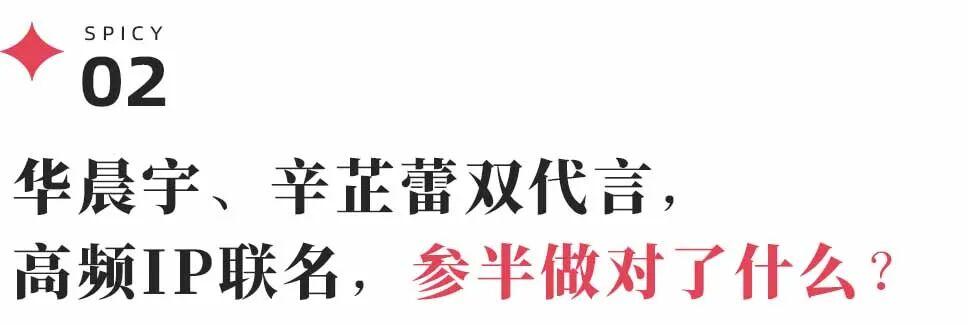 與此同時,參半在娛樂營銷上更是持續重金投入,通過與代言人深度共創以及高頻IP聯名,將性價比營銷策略發揮到極致。其中,品牌代言人華晨宇對其銷量和聲量拉動,起到了十分關鍵的作用。