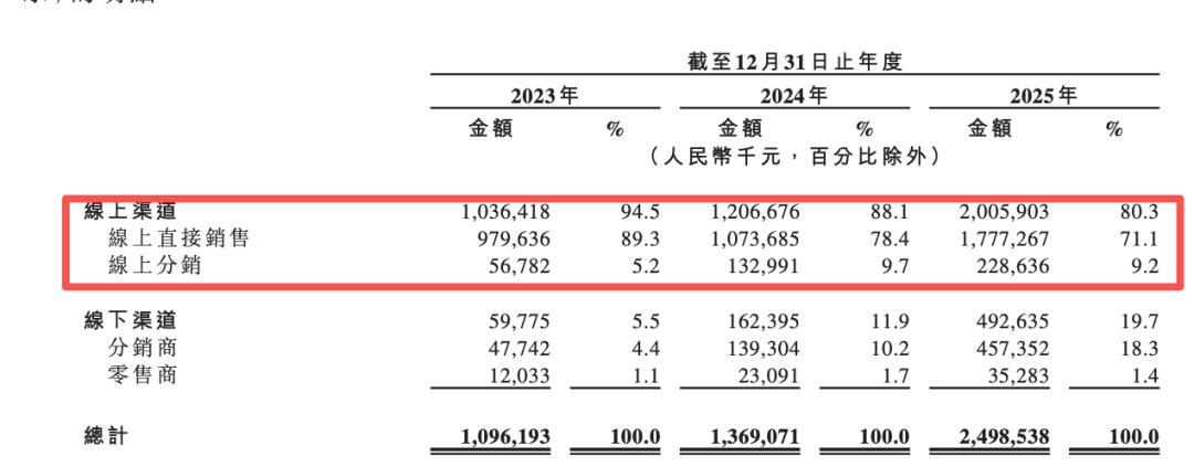 根據招股書顯示,小闊科技的營銷開支主要由電商平臺營銷開支、品牌推廣及明星代言費、電商平臺服務費三部分構成。2025 年,小闊科技線上渠道收入爲 20 億,營收佔比高達 80.3%。
