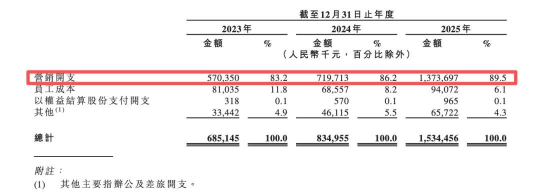 招股書顯示,2025 年小闊科技營銷費用達 13.74 億元,佔營收比重 55%。同期,小闊科技綜合毛利率 71.9%,但營銷費用率達到 54.8% ,意味着近七成毛利被營銷開支直接吞噬。