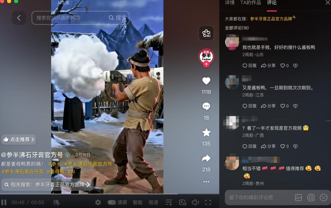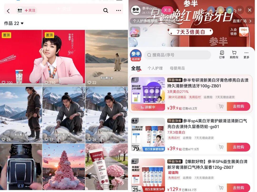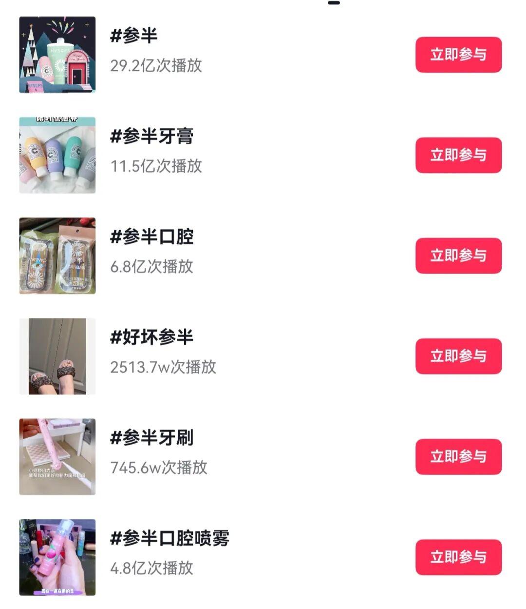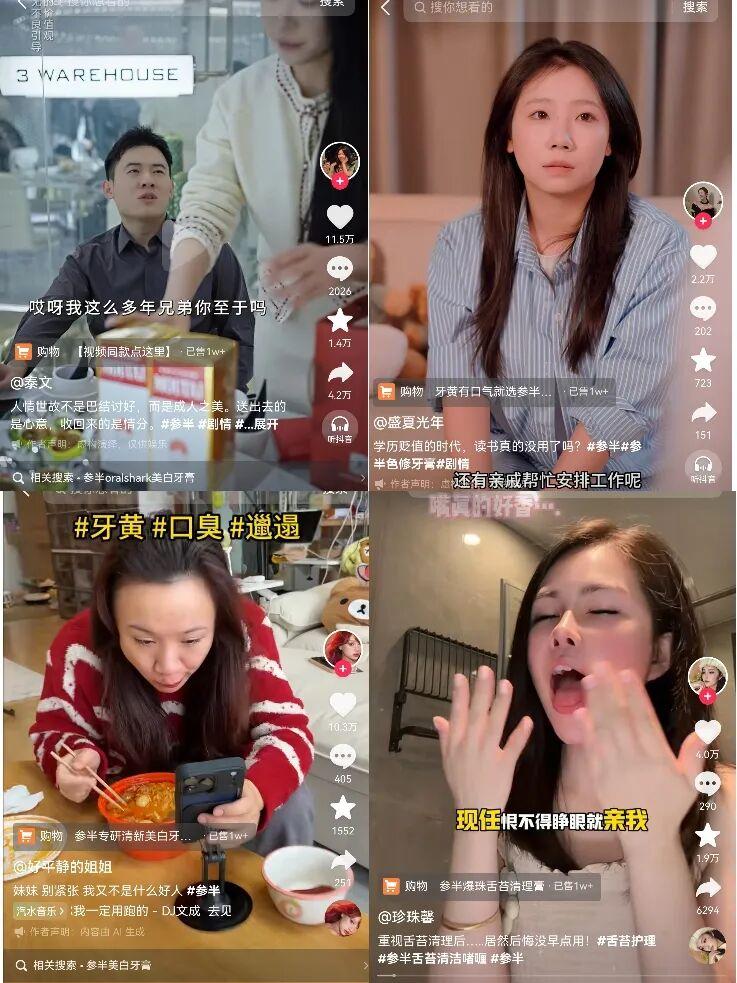 一方面是做大聲量、強勢破圈。抖音平臺數據顯示,# 參半 話題播放量高達 29.2 億次,# 參半牙膏 11.5 億次,# 參半口腔 6.8 億次,憑藉海量內容實現強曝光覆蓋。