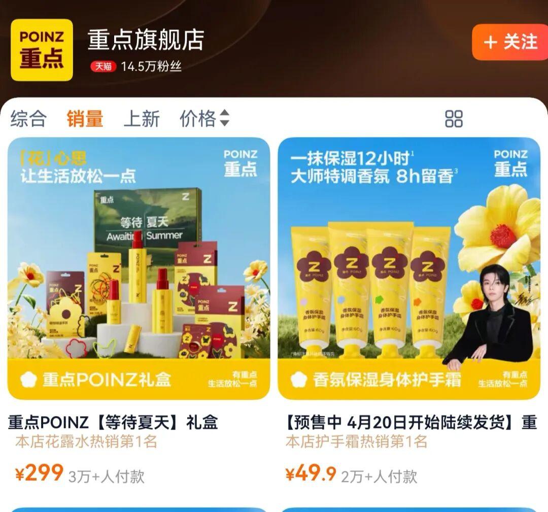 今年小闊科技與華晨宇合資打造的日化家居品牌“重點”,上線即爆賣。其全渠道 GMV 已突破 2100 萬元,一舉拿下天貓洗護、護手霜、花露水等多個類目店鋪榜榜首,這也成爲參半多品類擴張佈局中的重要成果。