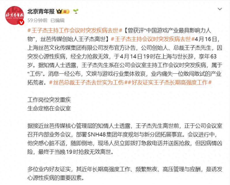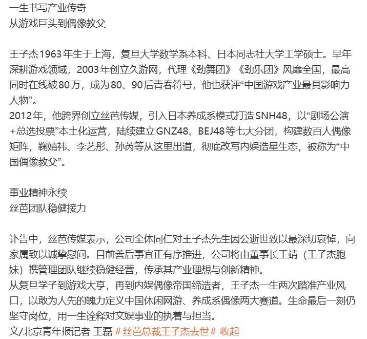 據接近絲芭傳媒核心管理層的知情人士透露,王子傑先生離世前,正於公司會議室召開內部業務會議,部署SNH48集團年度規劃與新分團拓展事宜。會議進行中,他突感心臟不適,隨即倒地,現場人員立即撥打急救電話並送醫搶救,但因病情兇險,最終於當天19時搶救無效離世。