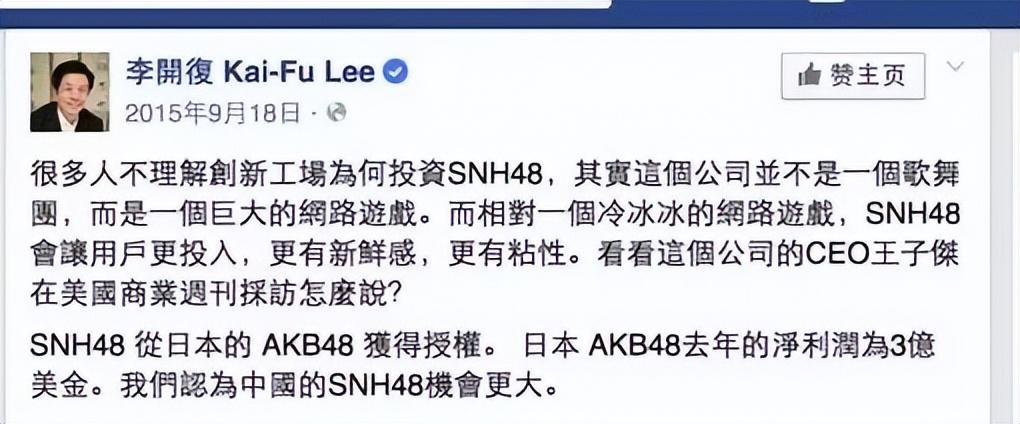總而言之,王子傑的專長就是將國外模式充分本土化、變現最大化,而非原創自研。韓國遊戲不行了,還有日本女團。2012年,已經49歲的王子傑創立大型女子偶像團體SNH48,作爲日本AKB48的官方姐妹團,先後獲得李開復的創新工場、黎瑞剛的華人文化投資。