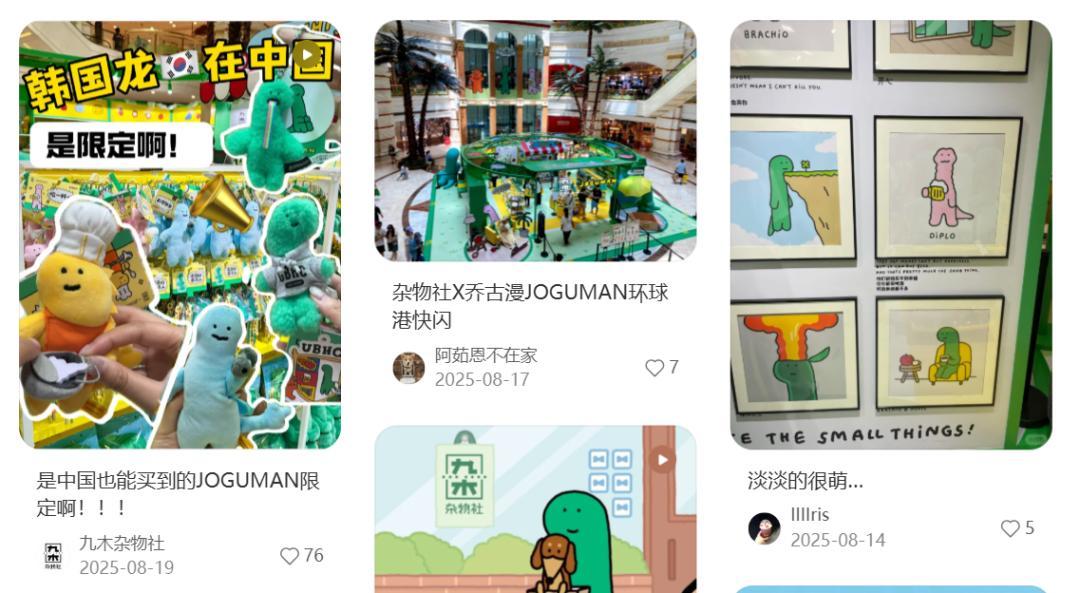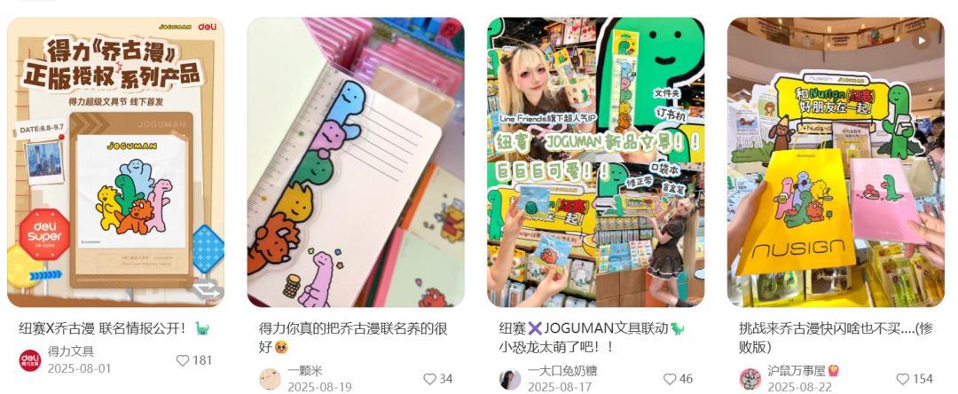去年的“喬古漫”就是一個縮影:2025年4月,九木雜物社搶下綠色小恐龍喬古漫JOGUMAN的IP聯名,這個韓國IP此前聯名的品牌是CASETiFY、澤田本家等,在內地的產品還相對稀缺。雜物社趁機定出了較高的溢價:15元的拍紙本,49.9元的掛繩,139.9元的抱枕,並策劃在8月開出快閃。然而,得力也在8月官宣了旗下文具副牌紐賽與喬古漫聯名,主打10-20元的日常平價文具,同步上線快閃店。雖然客單價稍微錯開,但雙方快閃檔期完全“撞車”,在營銷傳播上無疑成了一場硬碰硬的暗戰。