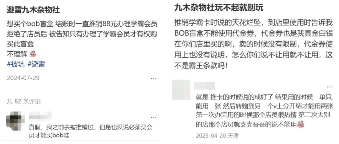 在網上搜索“九木雜物社”,關於會員卡的討論仍然居高不下。這些帖子大多集中在24-25年,也曾經是雜物社門店最具爭議的地方。除了南方都市報,在小紅書、黑貓等平臺上也有大量相關抱怨。