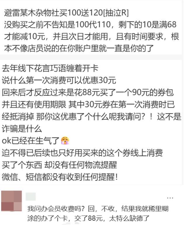 不少從雜物社離職的店員表示,當時的雜物社門店有嚴苛的開卡KPI和話術考試。小芹對雜物社的“心理陰影”,也是無數人消費體驗的縮影:有些店員會採用模棱兩可的誘導話術,如不告知優惠的生效條件、聲稱部分商品只有會員才能購買等。