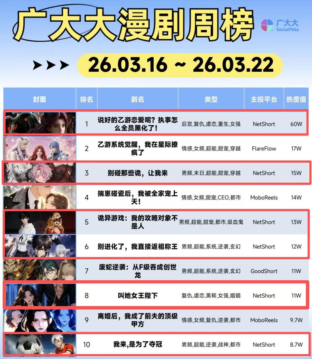廣大大漫劇周榜前十中,NetShort爲主投平臺的佔六部
