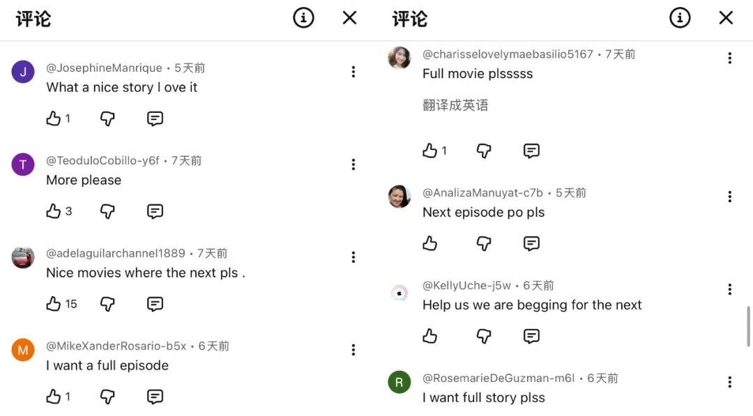此前在AI短劇評論區,觀衆經常會出戲地討論某部劇是否爲AI製作,似乎AI的炫技功能大於內容功能。但在這兩部AI短劇的評論區,用戶基本都被劇情所吸引,“Nice movie,Next please”等類似評論層出不窮。