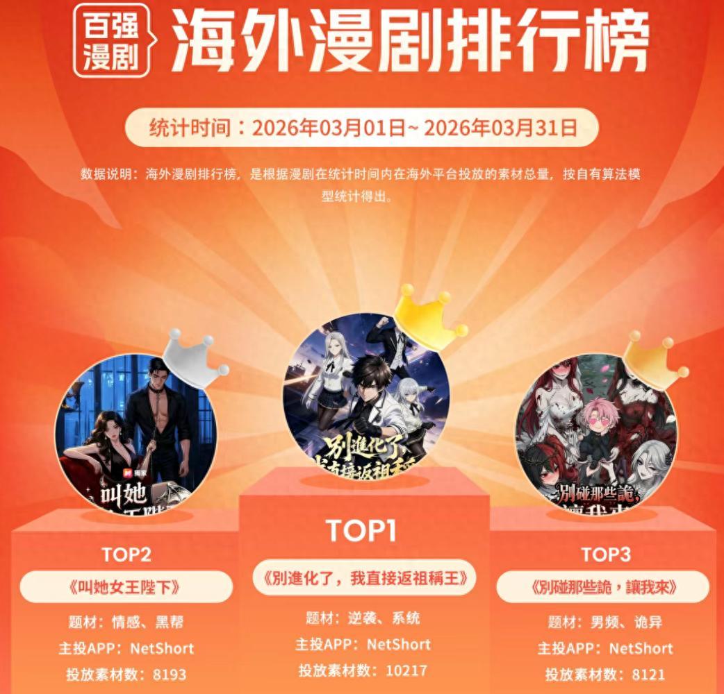 近日DataEye發佈的3月海外漫劇百強榜中,《別進化了,我直接返祖稱王》《叫她女王陛下》《別碰那些詭,讓我來》三部題材各異的內容登頂TOP3。
