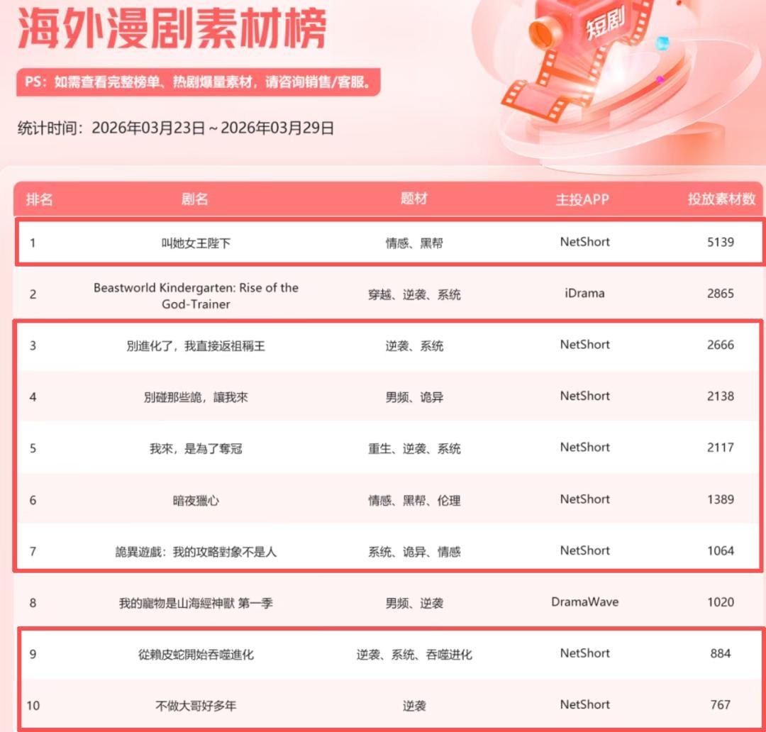 過去數週,NetShort在海外表現極爲亮眼,已佔據海外漫劇的半壁江山,最多時,周榜前十中能有八部漫劇的主投平臺都是NetShort,頭部作品斷層領先,日投放素材量峯值可達數萬組。