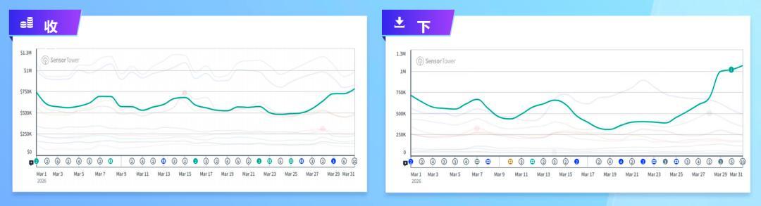 2026年Q1,NetShort付費和下載雙雙躋身行業前三。3月以來,NetShort增速進一步加快,數據顯示,其月投放素材數47.7萬組,躋身行業第一梯隊,下載量一度飆升至第一,且收入增長迅速,3月環比增長20%以上。SensorTower數據顯示,NetShort單日海外下載規模已經達到100萬規模,單日收入達到75萬美金。