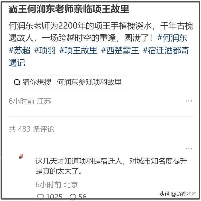 何潤東和文旅的聯動,除了亮相蘇超之外,還去參觀了項羽故居,給當地的旅遊景點做了宣傳。
