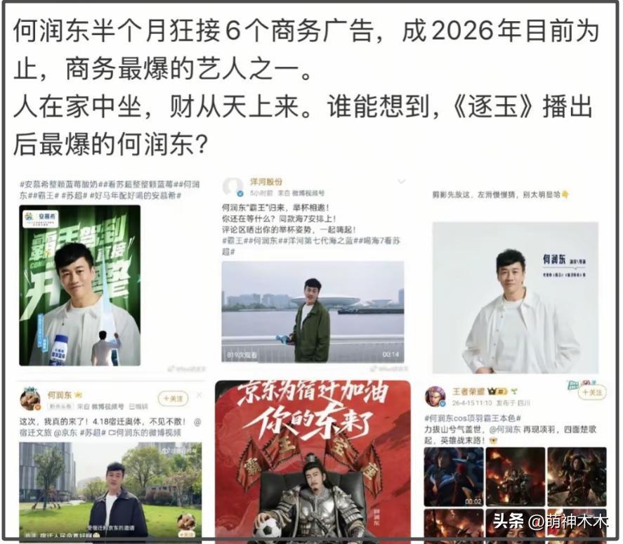 有網友統計,何潤東因爲這次的翻紅,半個月內就拿下6個商務廣告,雖然似乎是借熱度的短期代言,但這個速度內娛也很少有人能做到了。
