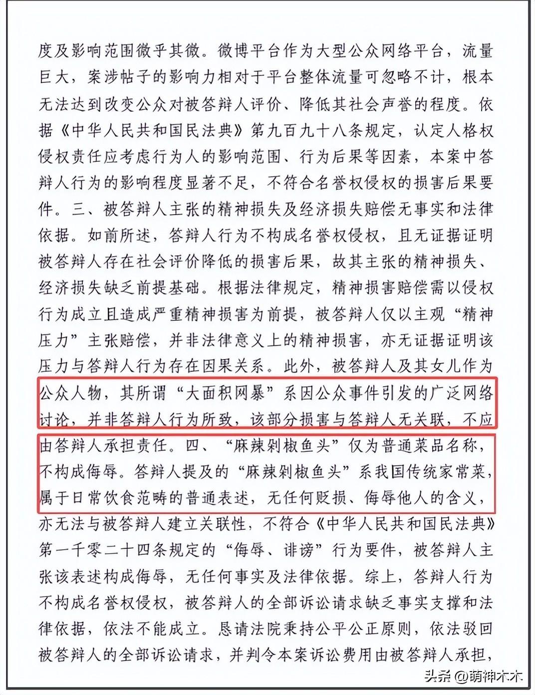 對於虞父控訴自己及女兒遭受到的大面積網暴控訴,法院也表示是公衆事件本身討論所致。而像“麻辣剁椒魚頭”等名稱屬於傳統美食名稱,不存在任何貶損和侮辱含義,不符合法律規定的侮辱誹謗要求。
