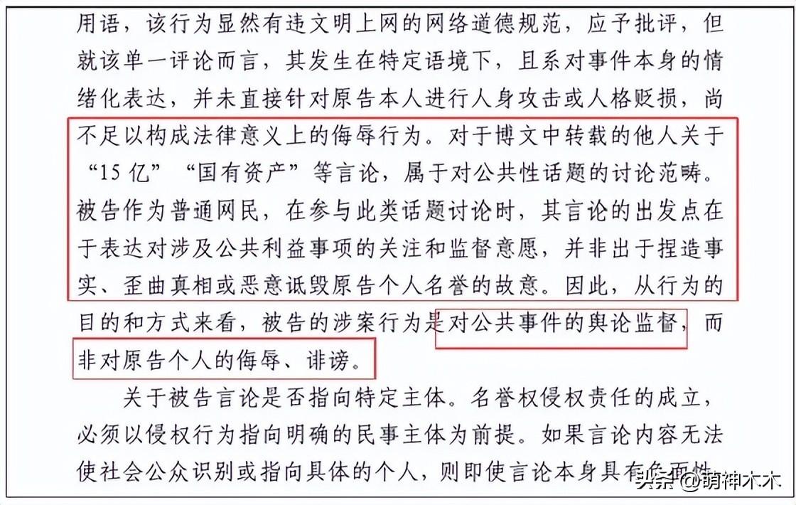 對於網友參與討論發佈“15億”、“國有資產”等話題,法院認爲言論出發點是表達對涉及公共利益事項的關注和監督意願,並非出於捏造事實歪曲真相詆譭名譽的故意,所以從行爲目的和方式來看並非是對虞書欣父親的侮辱和誹謗,只是對公共事件的輿論監督。