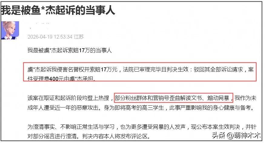 被告人稱相關案件從取證到起訴階段均上了熱搜,部分粉絲羣體及營銷號歪曲解讀文書煽動網暴,對她這個未成年人進行了長達一年的惡意攻擊,嚴重影響了她高三生的備考。而爲了澄清事實,她公開了判決書,還針對部分造謠她失聯跑路的謠言進行了說明。