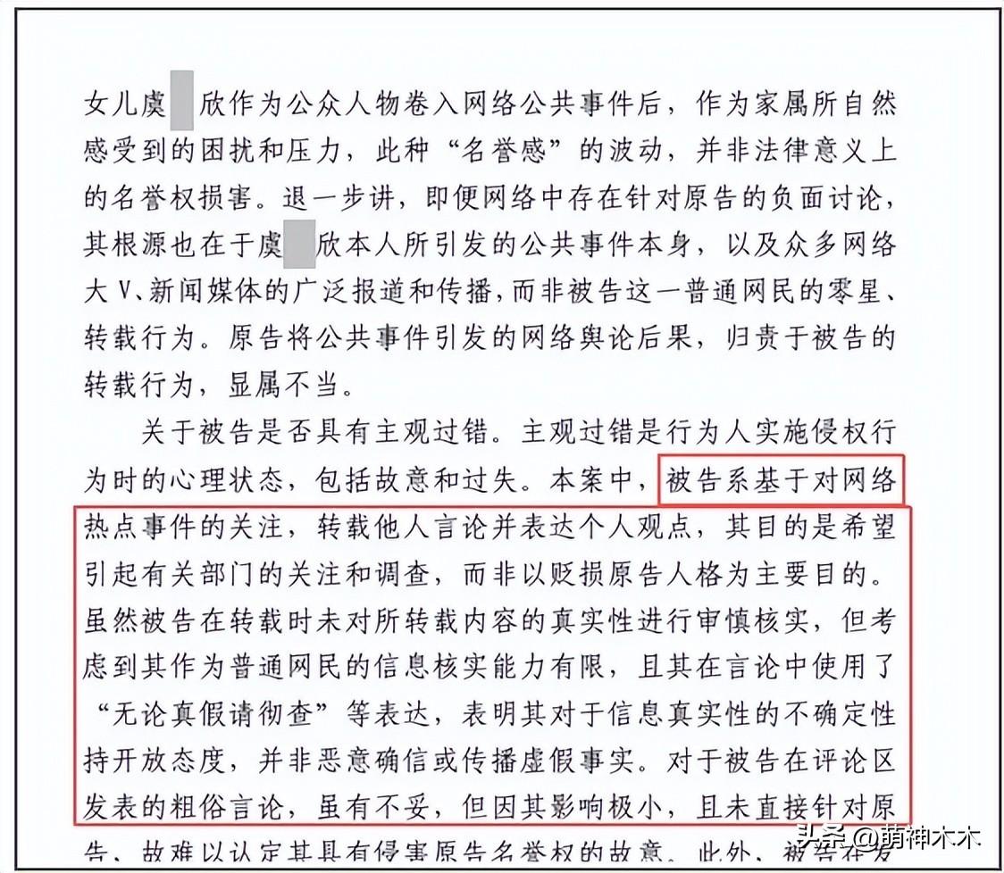 在判決書中,可以看到法院判詞相當犀利。法院指出虞書欣父親因家族財富、高利貸等爭議被網絡大量議論,已經形成公衆事件,若社會評價發生變化那是因爲公衆事件本身,而非參與討論的個體,與被告人無法形成因果聯繫。