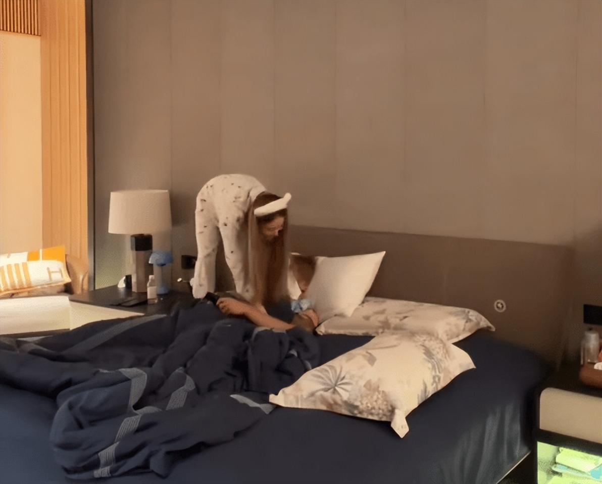 徐藝洋穿睡衣在牀上跳舞,十分活潑可愛。
