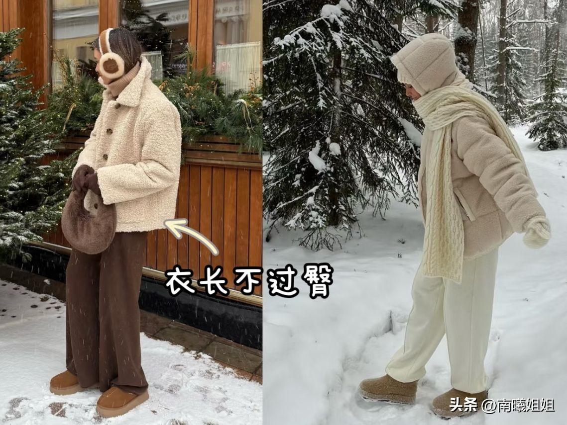 羊羔絨外套的長度,儘量控制在胯部位置,搭配的運動褲,褲腿垂感十足,遮擋住靴筒纔不會灌風,雪地帶點厚度,視覺上纔會更顯高。