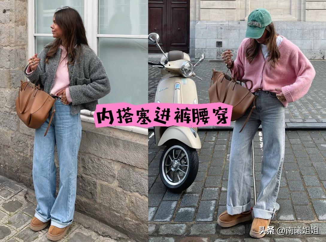 冬天穿毛衣外套,下身適合配條牛仔闊腿褲,簡約又耐看,而且還不挑人,再配雙厚底款式的UGG雪地靴,褲腿挽起來穿,利落又顯腿長。