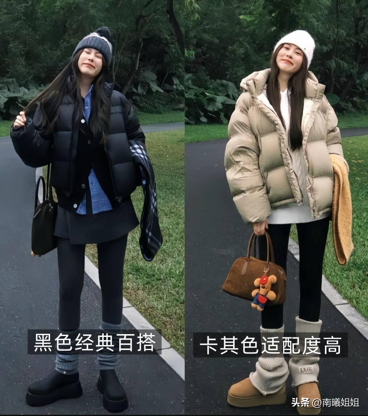 一雙經久耐穿的雪地靴,在色彩上,通常都是非常經典的,例如黑色的UGG雪地靴,百搭不易過時,很適合配黑色短款羽絨服,下身穿黑色鯊魚褲,再用灰色堆堆襪過渡,層次感拉滿。