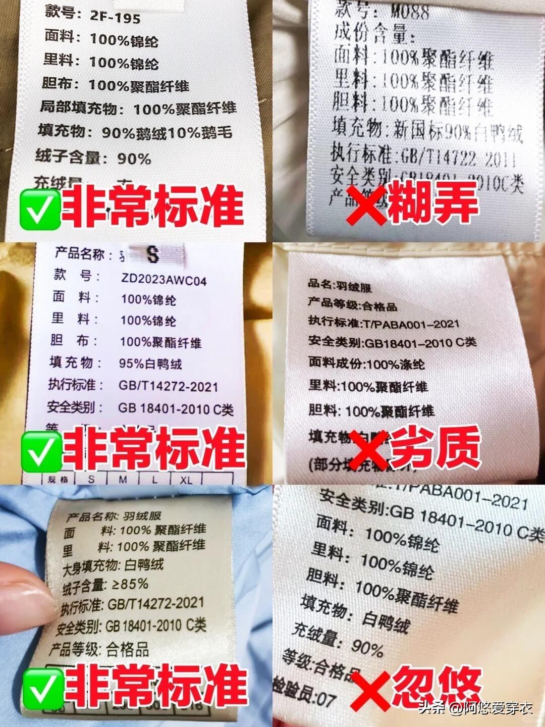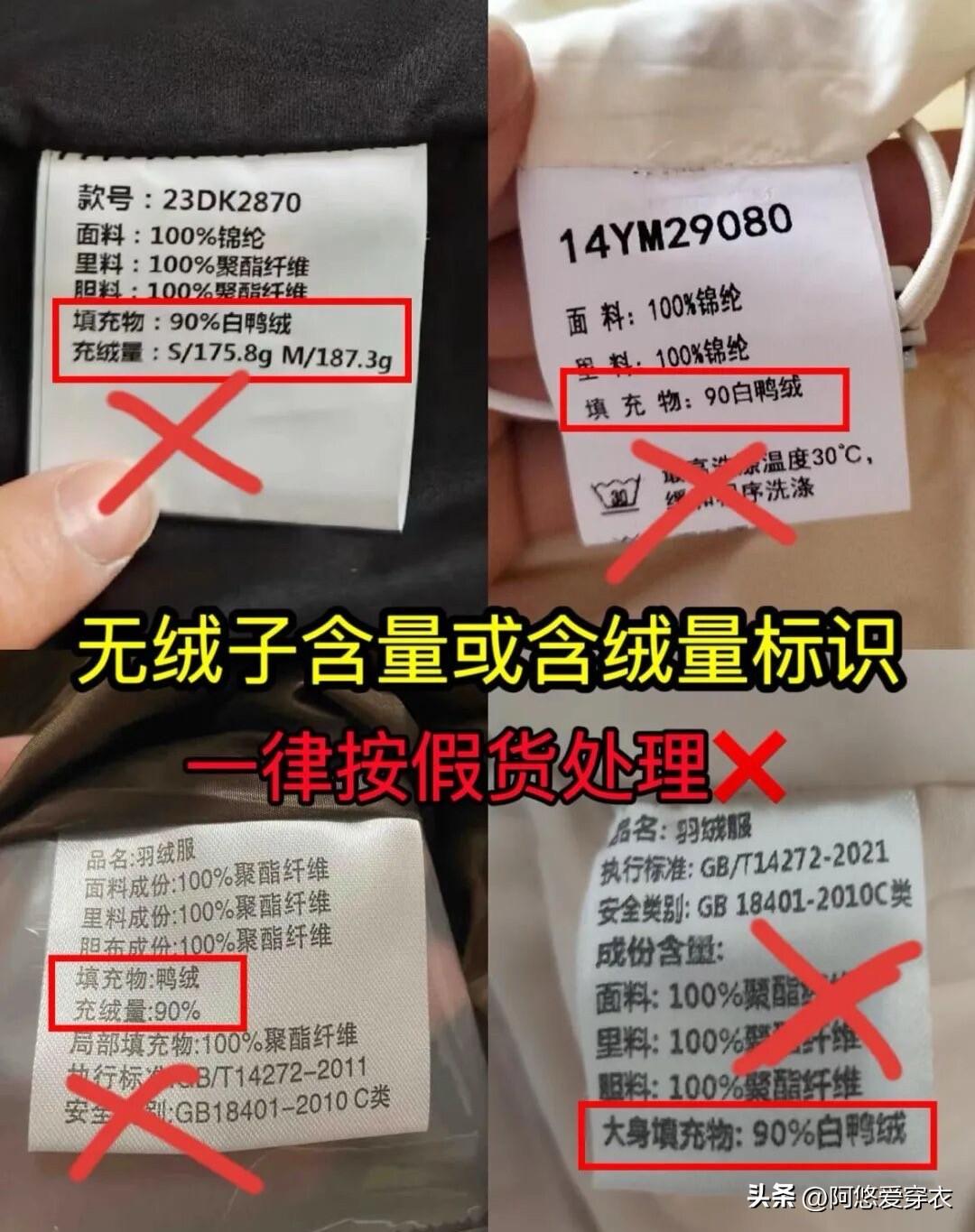像執行標準、安全類別、面料成分、絨子含量這都是最關鍵的指標,數據不對或者不符合要求的都得避雷,根據最新的新國標要求,正規的羽絨服必須標註 “絨子含量”,要是沒有看到這行字,咱們就pass吧。