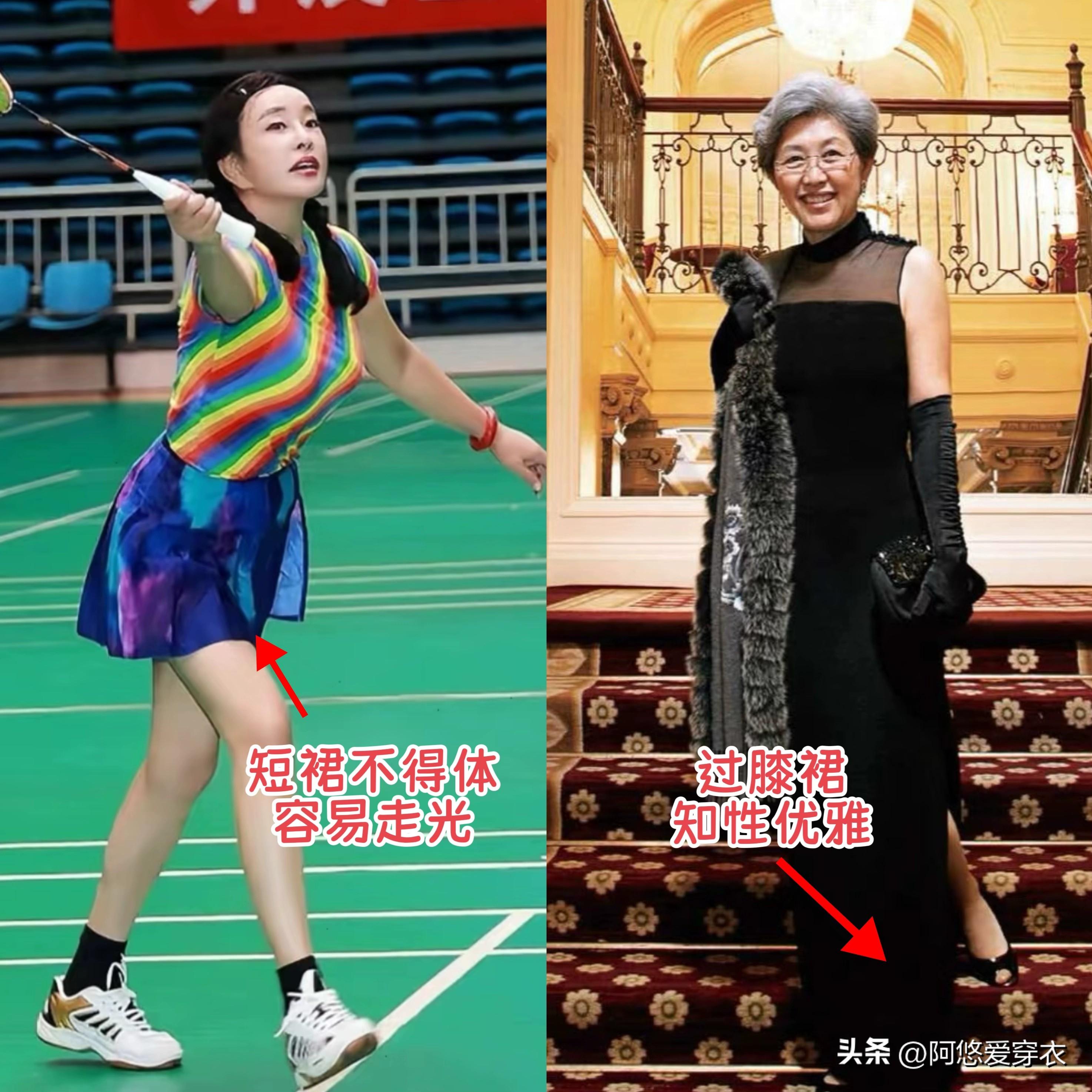 衣服的長度到底有多麼重要?看到傅瑩就懂了,上年紀的女人適合露膚度較低的搭配,如果強行穿短裙,不但會暴露自己的身材缺點,也有容易走光等風險,穿起來瞬間拉低你的氣質,而傅瑩每次穿裙子的時候,都會控制在膝蓋下方的長度,確保不走光,得體度高,也藏住了腿上的bug。
