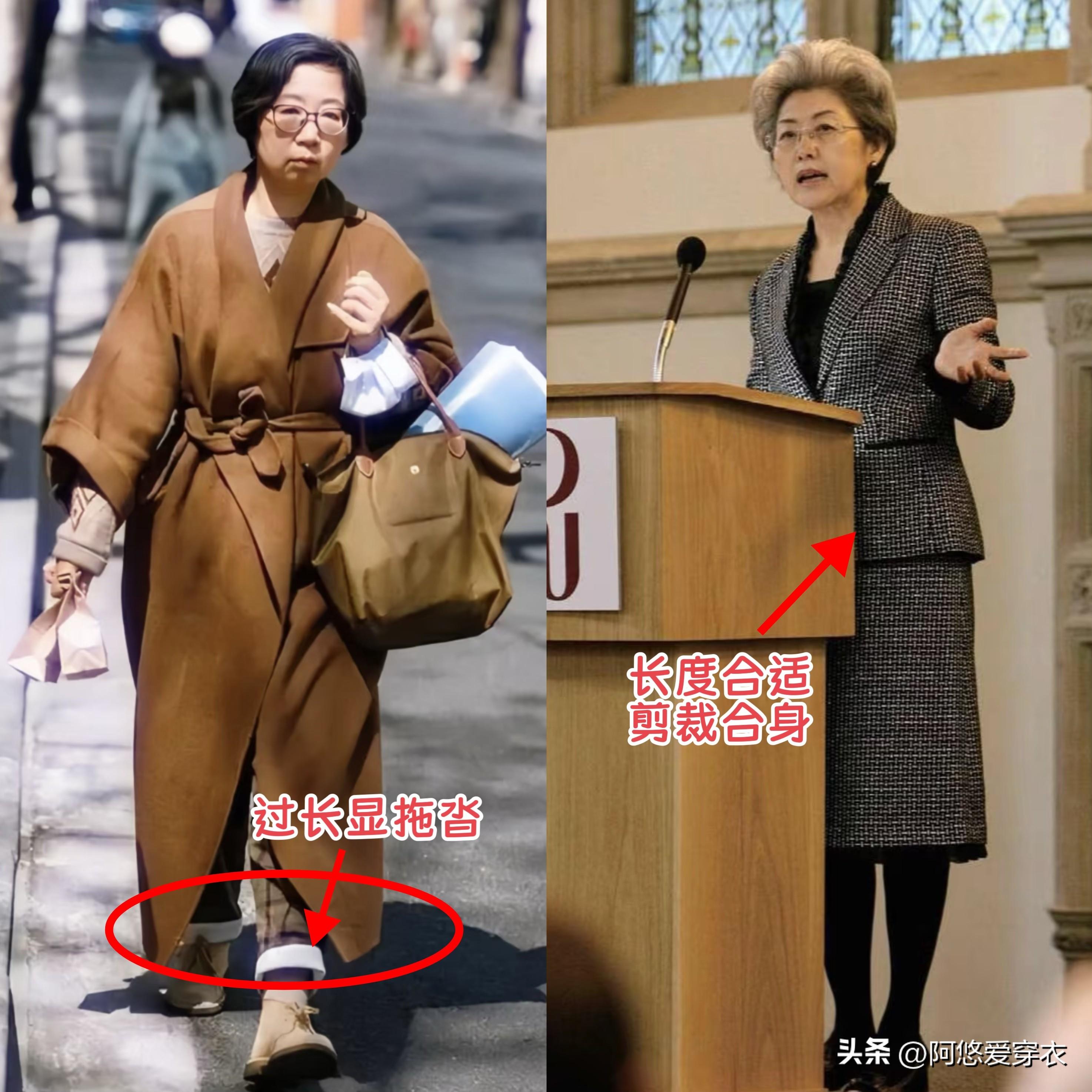 說到衣服穿長,很多人也容易走進誤區,比如穿的衣服太長,結果把自己的個子壓低了,像這種長款的過膝大衣,穿在身上特別的挑身材,到腳踝附近的長度會直接壓縮我們的比例,顯得拖沓。
