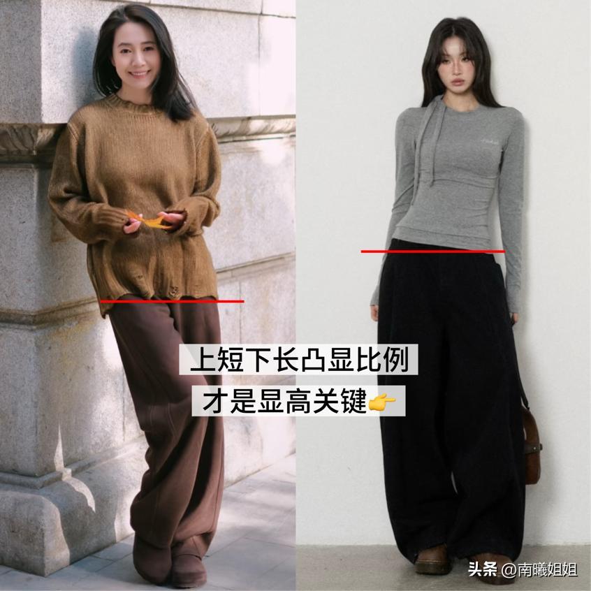 搭配的核心是突出腰線,避免壓垮比例。短款收腰上衣是最優解,無論是短款針織開衫、襯衫還是衛衣,都能直接露出高腰褲腰頭,打造“上短下長”的黃金比例,適配所有三款褲子,輕鬆拉長腿部線條。