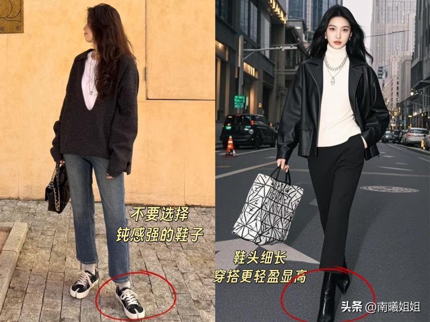 長鞋型能通過視覺延伸效果,讓腿部線條更連貫,避免褲腳與鞋履之間的“斷層感”,是粗腿搭配的點睛之筆。尖頭鞋憑藉延長腳尖的設計,讓腿部線條從褲腳自然過渡到鞋尖,搭配直筒褲或煙管褲時,能瞬間拉長腿部視覺長度;奶奶鞋則以“圓潤鞋頭+長鞋身”的特點,平衡香蕉褲或直筒褲的寬鬆感,舒適度與顯瘦效果兼具。搭配時只需保證褲腳貼緊鞋幫——九分褲露少量腳踝,長款褲輕微卷邊,再讓鞋履與褲裝同色或近色,就能強化線條連貫性,顯腿細效果更明顯。