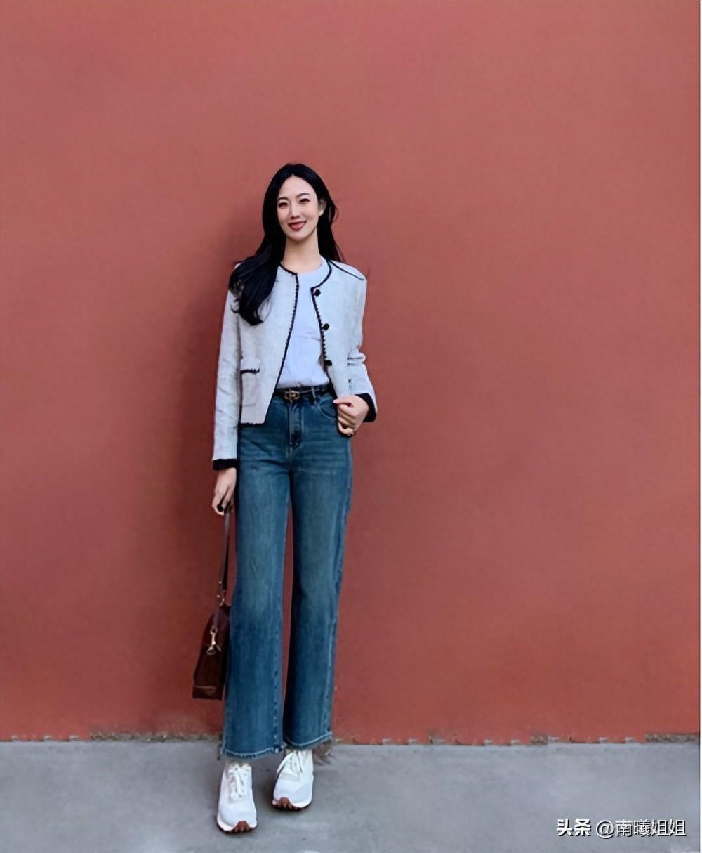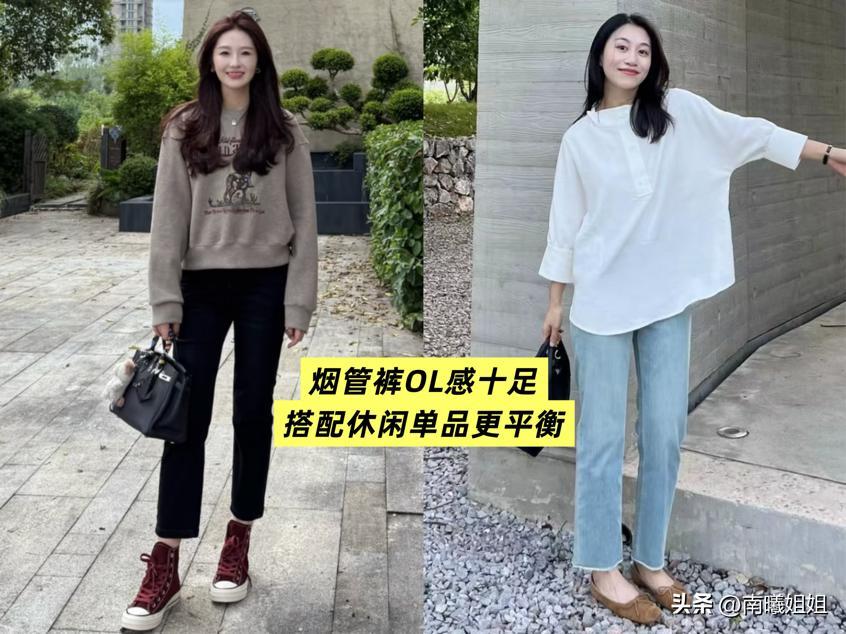 休閒場景追求舒適隨性,煙管褲的微收廓形能在放鬆的同時優化腿型。搭配方案一:九分牛仔煙管褲+oversize衛衣+尖頭帆布鞋,衛衣前側中間部分塞腰頭,露出腰線不壓個子,適合逛街、閨蜜聚會或日常遛彎;方案二:卡其色西裝煙管褲+牛仔外套+奶奶鞋,牛仔外套的休閒感與煙管褲的利落感互補,舒適度拉滿,週末出遊或短途出行穿恰到好處,小腿肌肉和大腿贅肉都能被巧妙掩蓋。