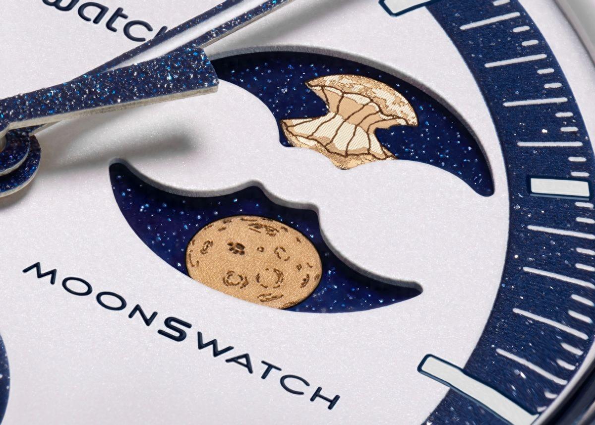 新款腕錶設計呼應前代產品,搭配相同的星空錶盤佈局,採用了瑞士斯沃琪創新的地相指示器,並配備飾以歐米茄(OMEGA)Moonshine 18K 金(Moonshine™ Gold)的月相指示器和 Snoopy 世界插圖。