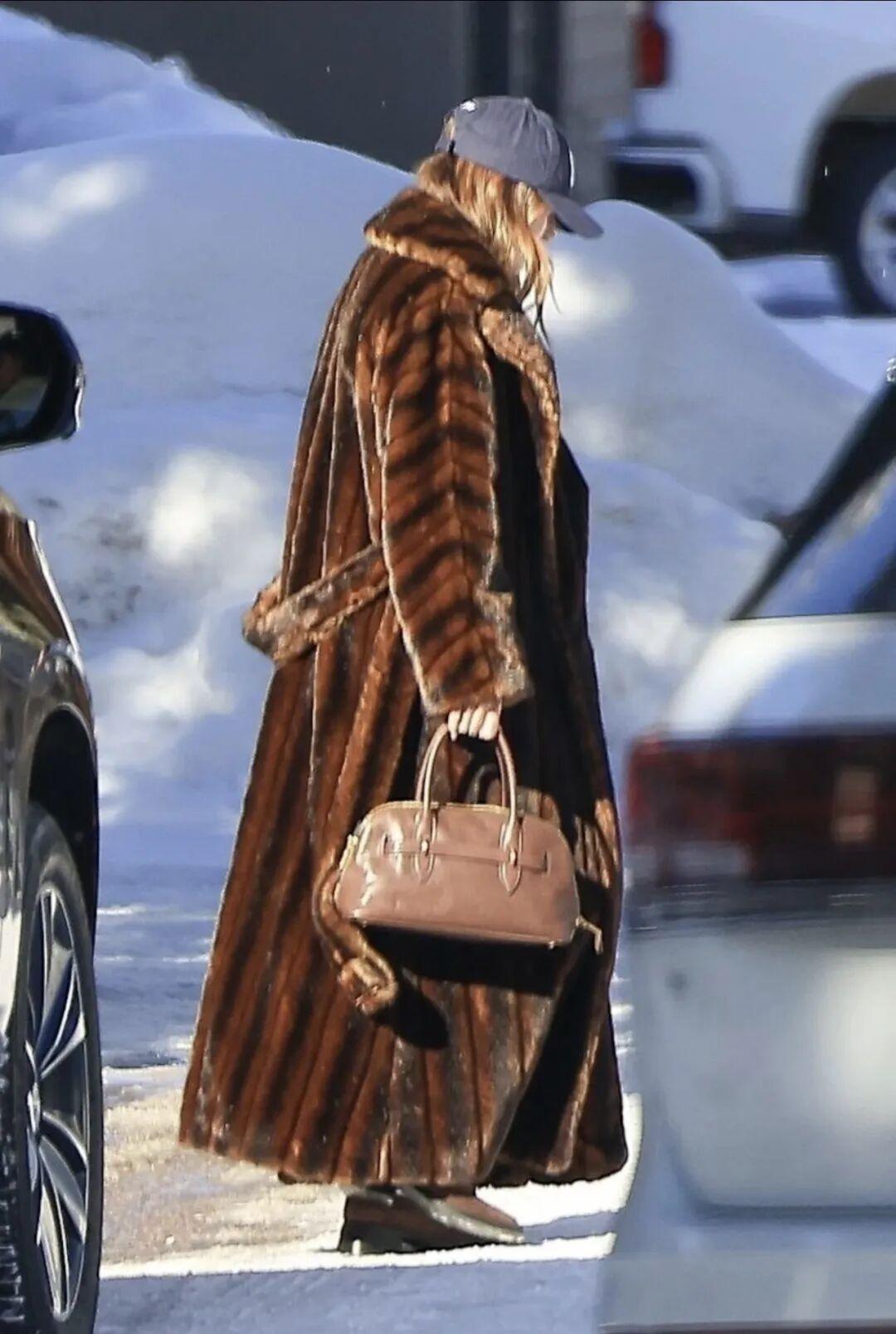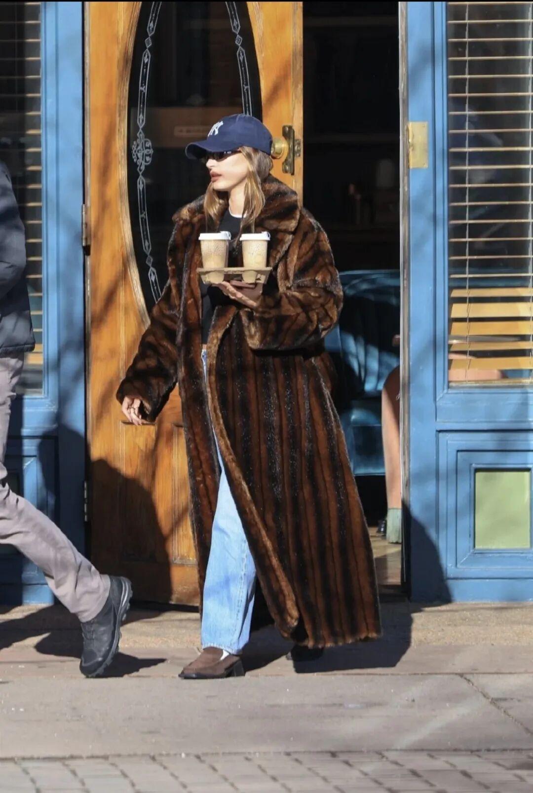 帶火無數衛衣+長款外套的Hailey Bieber一樣沒放過長款皮草,年初在滑雪勝地Aspen度假的海莉被拍到身穿RalphLauren 1995 FW的超長款貂皮大衣在街頭買咖啡。這件20世紀90年代的時裝作品被Hailey重新穿出了第二重街頭韻味,棒球帽+簡單黑色內搭+淺色牛仔褲+麂皮單鞋,海莉穿搭依舊如此扛打。