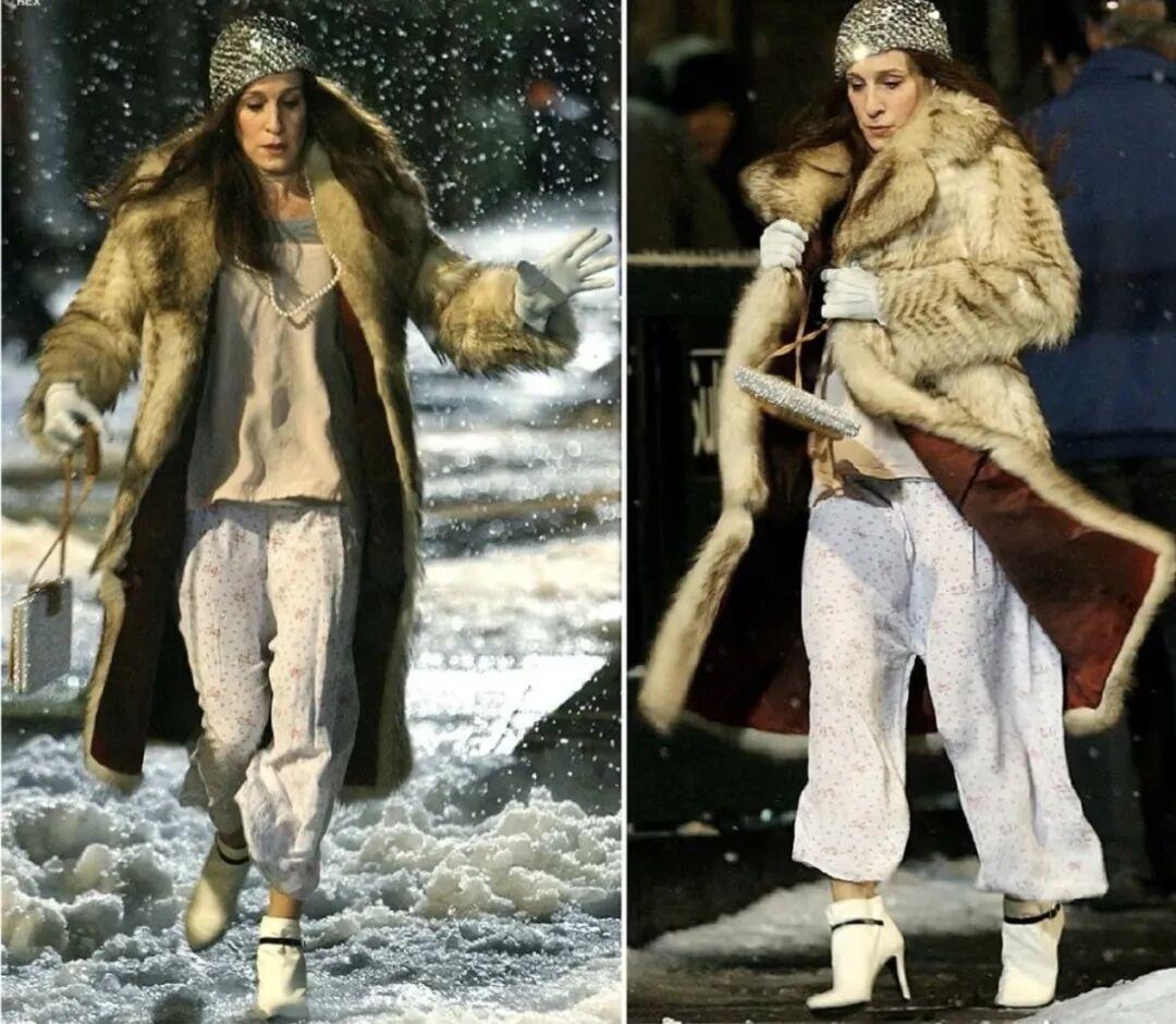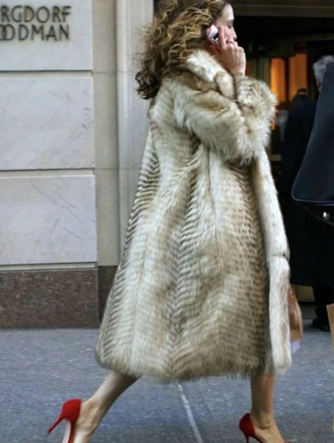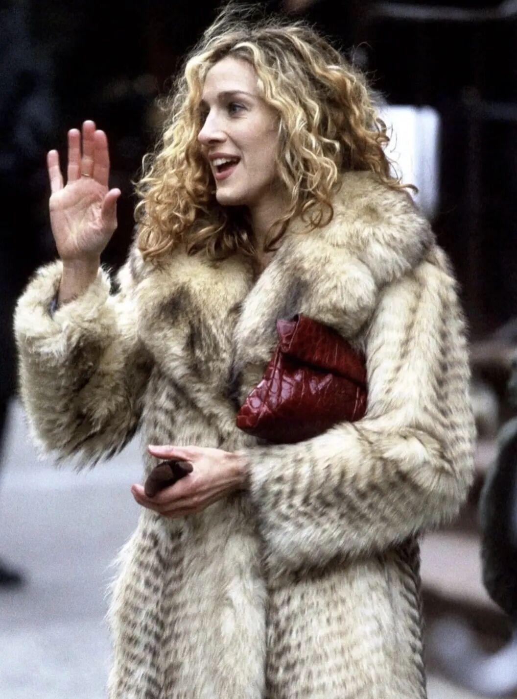 若說皮草“千金感”,就不得不提到《慾望都市》中Carrie那些經典的皮草造型。不管是光腿洋裙還是成套睡衣,Carrie都會在下面穿上一雙高跟鞋,這樣的搭配和皮草相加不僅沒有怪異之感,反而使曼哈頓的冬天都顯得時髦起來。