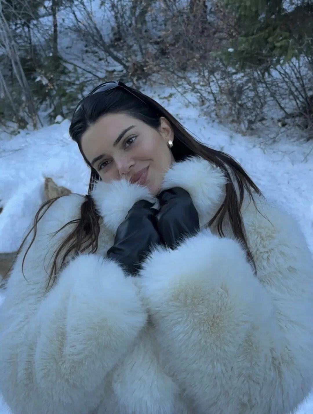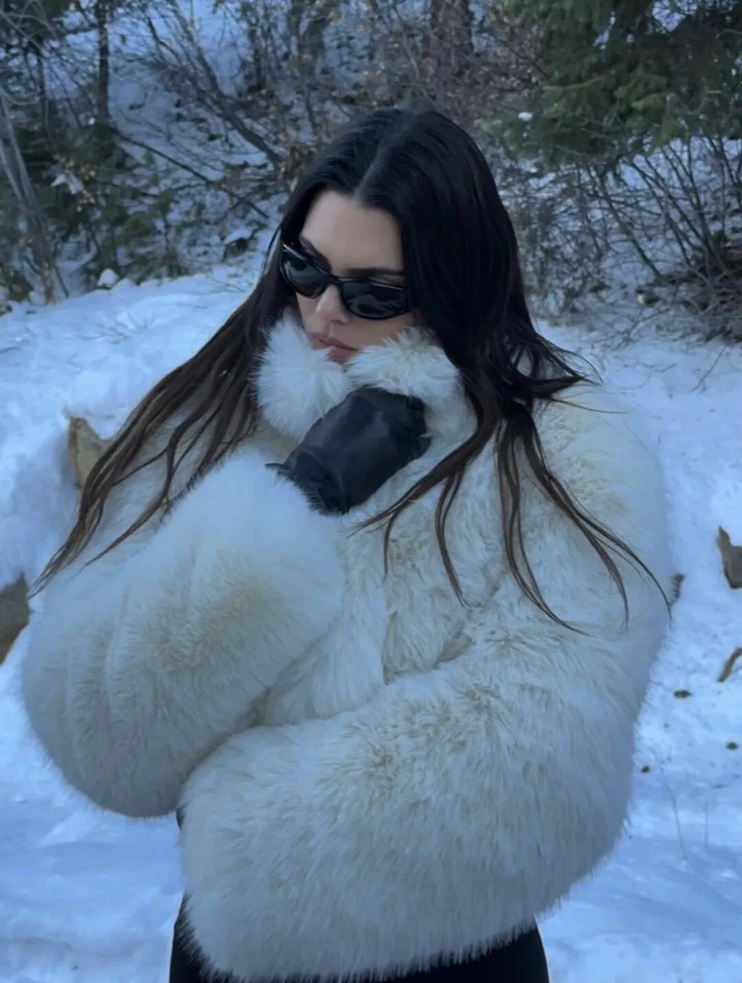 同樣在雪地裏演繹短款皮草穿搭的還有肯豆這組經典的毛茸茸照片,大面積的白色雪景和白色外套中黑色墨鏡和皮質手套點綴的得格外恰當,這類小單品兼具實用性和存在性,是冬天搭配選擇的不二之選。