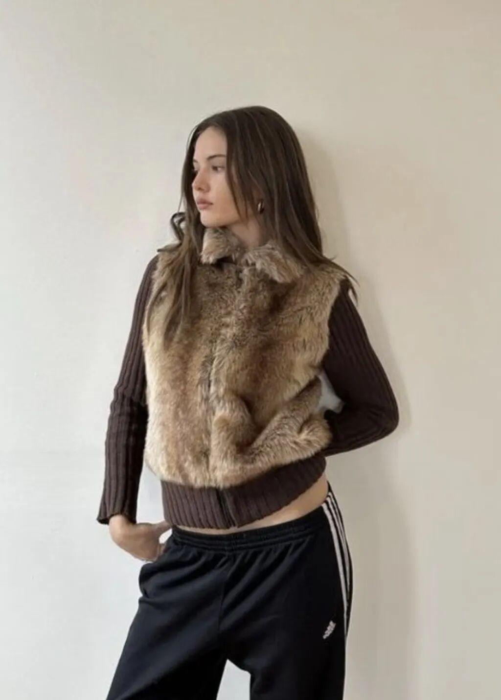近年來局部皮草的外套也愈加流行,毛衣的袖管加上皮草的背心設計讓人想起小時候媽媽總執着的那件“毛背心”,小短款的收腰鬆緊很好地綜合了皮草蓬鬆的外顯,又保暖又時髦,這次也總算沒有忘記媽媽“好好穿衣”的愛之交代。